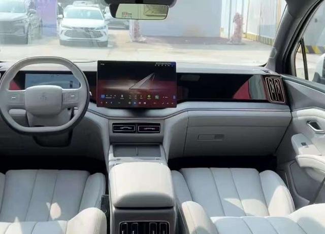 内饰方面,宋Ultra EV的中控台布局简约,中间位置使用了大块的黑色烤漆饰板,采用电子怀挡,配备双幅多功能方向盘、内嵌式液晶仪表、悬浮式中控大屏,部分车型还会提供W-HUD抬头数字显示、副驾智能3D景深氛围灯等,副仪表台是上下双层结构,上面一层有50瓦手机无线充电面板、一组实体按键、杯托等。