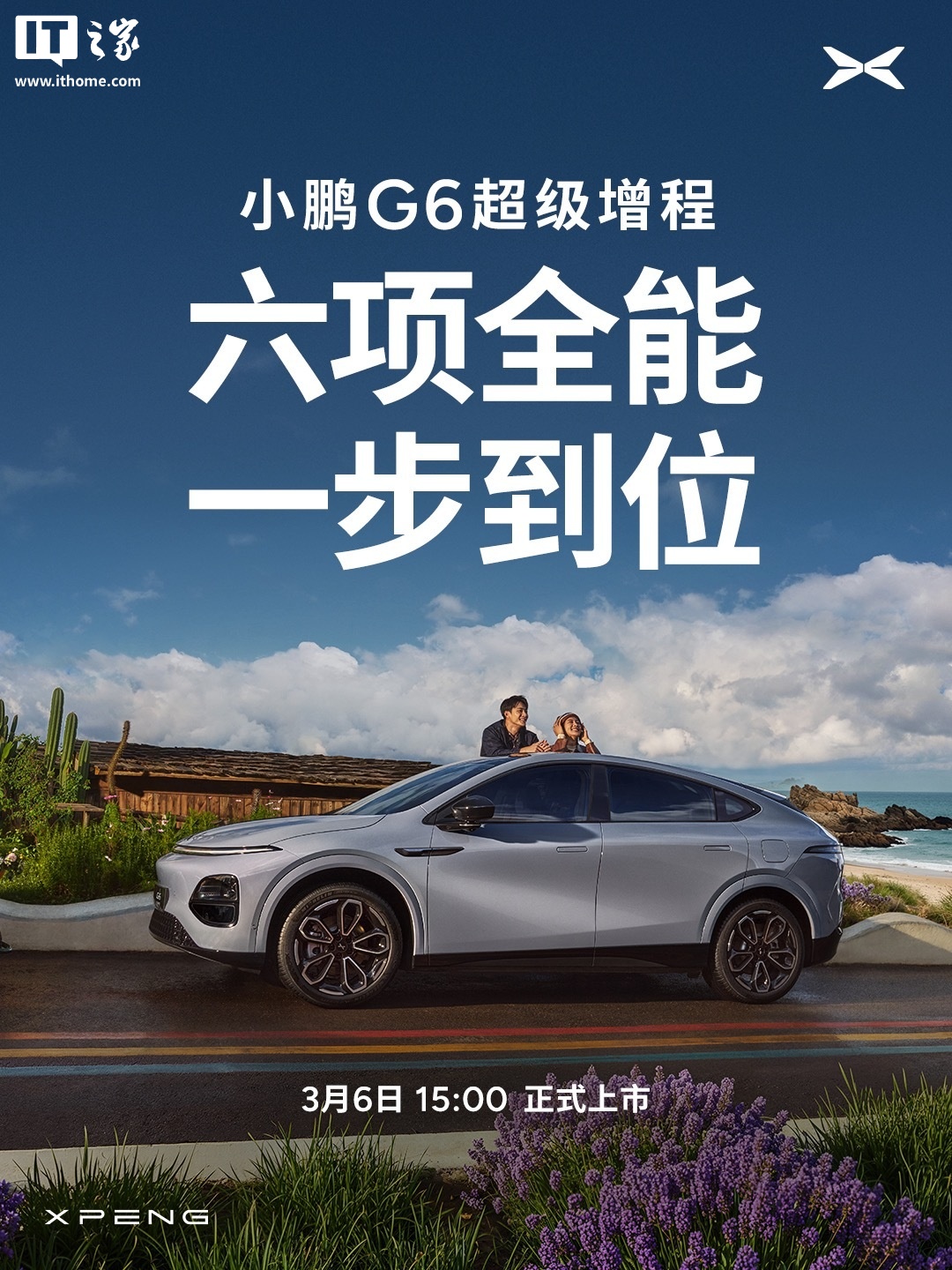 IT之家 3 月 5 日消息,小鹏汽车官方今日宣布,小鹏 G6 超级增程轿跑 SUV 将在 3 月 6 日 15:00 上市,宣称“六项全能 一步到位”。